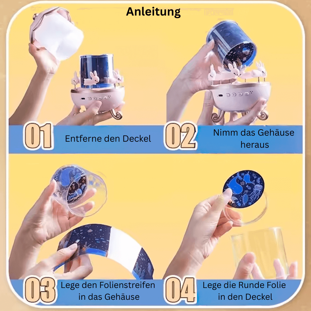 Die Folien sind leicht austauschbar. So kann Dein Kind, je nach Stimmung, immer die passende Folie auswählen und die zauberhafte Atmosphäre genießen.