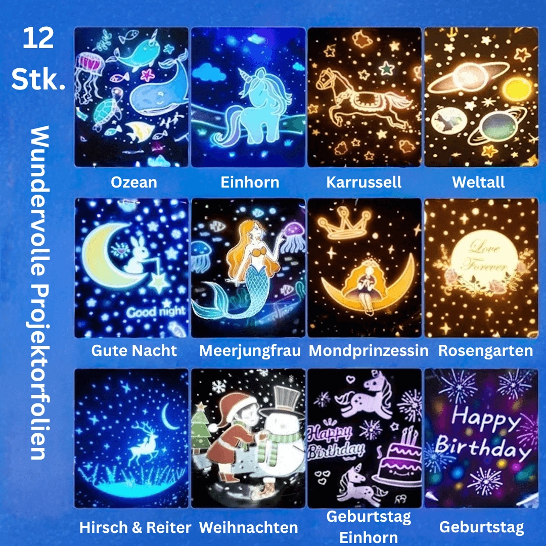💟12 traumhafte Projektionsfolien: Du kannst ganz einfach und jederzeit die Projektionsmotive austauschen und so für Abwechslung sorgen. So kommt garantiert keine Langeweile bei Deinem Kind auf. Hinweis: Die angezeigten Folienmotive können pro Lieferung variieren.